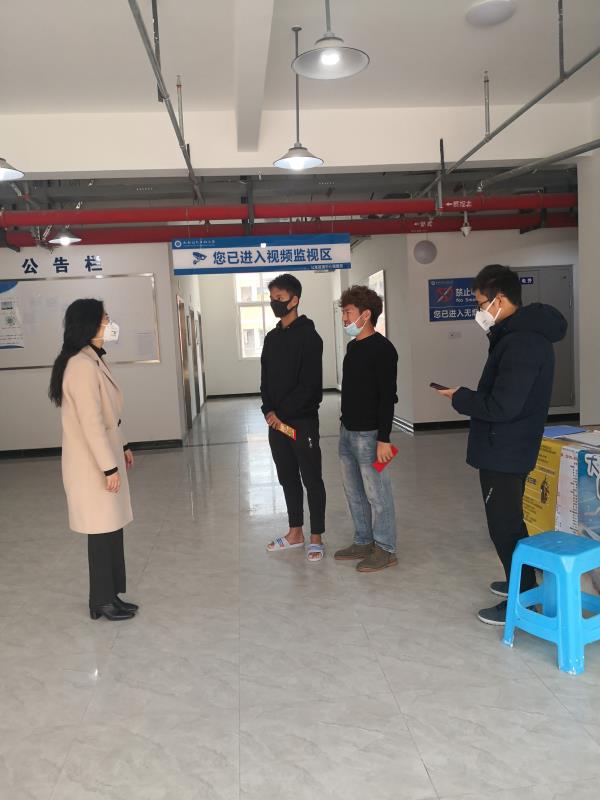 在21栋宿舍,王嵩与留校学生亲切交谈,发放了春节礼包,详细询问了留校同学的学习、生活情况,她同时嘱咐学生,要理性对待疫情,保持宿舍卫生,做好自我防护,常通风、常洗手,不去人群聚集的地方,降低感染风险;做好合理的学习生活安排,树立信心,共渡难关;与父母和辅导员老师保持联络,关注班级信息。