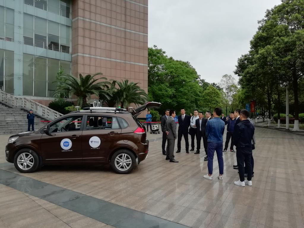 在签约仪式和启动仪式开始前,控制工程学院蒋涛院长团队研制的无人驾驶汽车和巡检机器人进行了动态展示,部分领导试乘了无人驾驶汽车,反响强烈。据了解,本次参加展示的车辆是该团队研制的第一代和第二代无人驾驶汽车,第一代无人驾驶汽车基于燃油汽车平台,是西南地区第一辆无人驾驶汽车,而第二代无人驾驶汽车则基于纯电动汽车平台,在去年科博会上引起广泛关注。无人驾驶汽车作为5G应用的理想领域之一,将成为我校与中国电信成都分公司战略合作以及5G应用示范校园建设的重点领域。