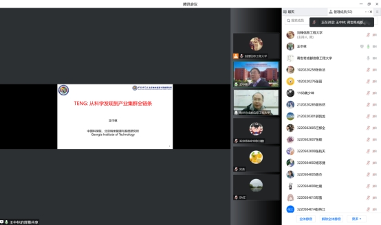 12月09日下午,中国科学院外籍院士、中国科学院北京纳米能源与系统研究所所长、中科院大学纳米科学与技术学院院长、佐治亚理工学院终身校董事讲席教授王中林应邀通过腾讯会议直播来到太阳成集团tyc33455cc机器人与智能系统国际联合研究中心系列学术报告大讲坛,为直播间100多名师生带来了一场名为“TENG: 从科学发现到产业集群全链条”的学术盛宴。讲座由本中心执行主任蒋世奇教授主持,吸引了多所高校的多名教师和学生参加。