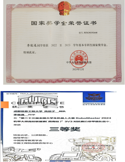 除了在课堂上取得的成绩,李俊逸还深刻理解了综合能力的重要性,在实验室中,他不仅在技术上严格要求,协调团队齐力攻坚克难。他参与了中国机器人大赛预选赛,荣获了全国三等奖,并成功晋级国赛。在随后的国赛中,获得了两个全国二等奖的好成绩。除了在机器人大赛中取得佳绩,李俊逸还作为团队副队长带领队员一起积极参与了RoboMaster机甲大师赛。作为副队长,他和团队成员一起努力,从机械到控制,最后到视觉导航,最终团队荣获全国二等奖,这不仅是对他本人能力的肯定,也是对整个团队努力的认可。除此之外,李俊逸还与同学组队参加了五一数学建模比赛,荣获国家级三等奖。随着时间的积累,李俊逸的专业能力和对机器人的热情得到了广泛认可。他被选任为SIRB实验室机械组负责人兼任实验室项目管理,负责比赛的赛季规划、项目进度把控以及资金的使用规划,确保实验室项目顺利进行。